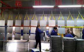 花都集团拥有先进的瑞士金马静电喷涂生产线,整个喷涂线全长400多米, 12把德国进口自动喷枪和2把手动喷枪